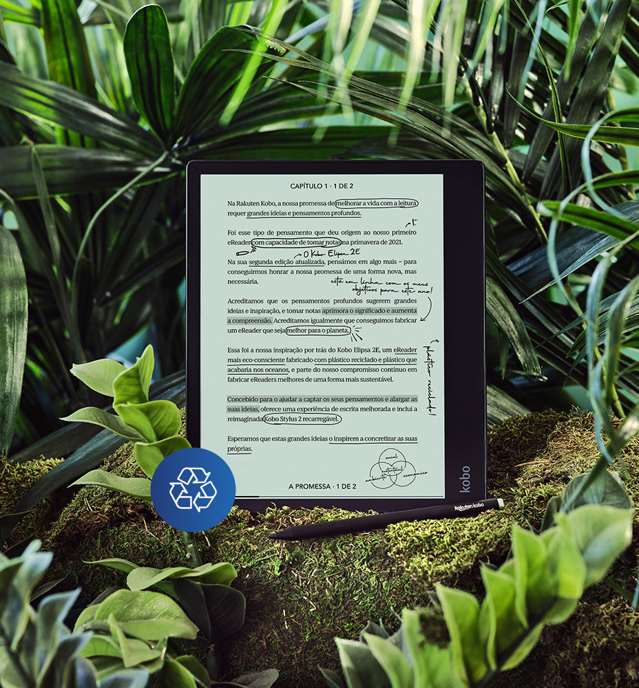 Como parte do nosso compromisso em utilizar materiais mais sustentáveis nos eReaders da Kobo, o Kobo Elipsa 2E é fabricado com plástico reciclado e plástico que acabaria no oceano, bem como uma liga de magnésio reciclada. A sua embalagem também é mais sustentável. Saiba mais em kobo.com/eco