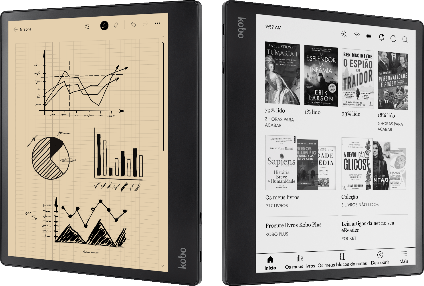 Encontre milhões de títulos na eBookstore da Kobo diretamente no Kobo Elipsa 2E. O Kobo Elipsa 2E tem 32GB** de armazenamento, para que tenha sempre espaço para os seus eBooks, audiolivros Kobo e todas as notas e ideias. A longa vida útil da bateria é igualmente impressionante, oferecendo até semanas de energia†† com um único carregamento.
